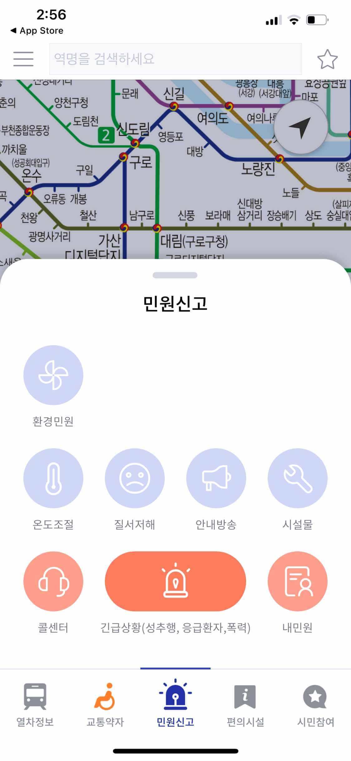 전철을 타고 가다가 불가피한 일이 생기거나 민원을 넣고 싶을 때 어플을 켜서 바로 문자, 전화로 민원을 넣을 수 있습니다. 자동으로 위치를 실시간으로 파악합니다. 여름이나 겨울에는 온도조절 요청도 할 수 있고, 마스크 미착용자 신고, 응급환자, 성추행, 잡상인 등 다양하게 신고를 할 수 있습니다.